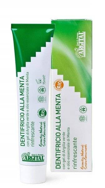 Argital Odświeżająca pasta do zębów naturalna z miętą i zieloną glinką 75 ml w swoim składzie posiada składniki, pochodzące z naturalnych ekologicznych upraw. Dzięki temu pasta ma właściwości hipoalergiczne i nie zagraża środowisku. Dzięki absorbującym właściwościom zielonej glinki, usuwa cały brud z zębów, nie podrażniając dziąseł ani języka.