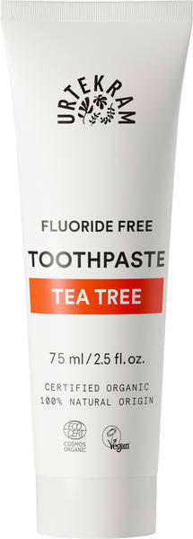 Ekologiczna pasta do zębów Urtekram z wyciągiem z drzewa herbacianego jest w 100 procentach naturalna, nie zawiera żadnych chemicznych, szkodliwych dla zdrowia i środowiska składników, ani produktów pochodzenia zwierzęcego. Wszystkie składniki użyte w recepturze pasty są pochodzenia roślinnego z ekologicznych upraw. Nie zawierają SLS- sów, ani fluoru, o którego szkodliwości coraz cześciej się mówi.