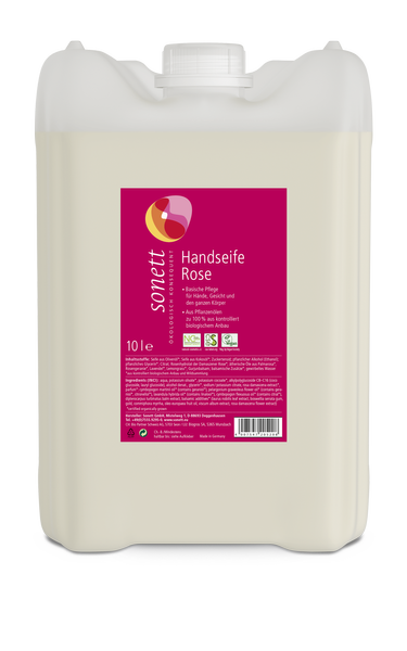 Sonett Mydło w płynie róża 10 l to nie tylko świetny wybór dla naszej skóry, ale również dla naszej planety. Wypróbuj już dziś i doświadcz naturalnego, organicznego i ekologicznego rytuału codziennej pielęgnacji z Sonett.SkładSkład: woda, mydło potasowe z oliwy z oliwek*, mydło potasowe z oleju kokosowego*, poliglukozyd alkilowy C8-C16 (glukozyd kokosowy, glukozyd laurylowy), alkohol denat., gliceryna*, cytrynian sodu/potasu, wyciąg z róży damasceńskiej*, zapach: [olejek z palczatki imbirowej* (zawiera geraniol*), olejek z kwiatów pelargonii pachnącej* (zawiera geraniol* i cytronelol*), olejek z lawendy wielkiej* (zawiera linalol*), olejek z trawy cytrynowej* (zawiera cytral*), wyciąg z żywicy Dipterocarpus Turbinatus, dodatki balsamiczne* (wyciąg z liści wawrzynu szlachetnego, guma z kadzidłowca, złoto, mirra, oliwa z oliwek, jemioła pospolita, róża damasceńska).Skład INCI: Aqua, Potassium Olivate*, Potassium Cocoate*, Alkylpolyglucoside C8–C16 (Coco Glucoside, Lauryl Glucoside), Alcohol denat., Glycerin*, Sodium / Potassium Citrate, Rosa Damascena Extract*, Parfum*: Cymbopogon Martinii Oil* (contains Geraniol*); Pelargonium Graveoleus Flower Oil* (contains Geraniol*, Citronellol*), Lavandula Hybrida Oil* (contains Linalool*), Cymbopogon Flexuosus Oil* (contains Citral*), Dipterocarpus Turbinatus Balm Extract, balsamic additives* (Laurus Nobilis Leaf Extract, Boswellia Serrata Gum, Gold, Commiphora Myrrha, Olea Europaea Oil, Viscum Album, Rosa Damascena). z certyfikowanych upraw ekologicznych
